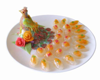 上海龍華寺の精進料理を基礎に、宮廷料理、民間精進料理の作法も取り入れ、南北地方の味付けで調理してます。三亜熱帯地方の特色を生かし、一切お肉(魚介も含む)を使わず,熱帯フルーツ、花類、旬の野菜などを使い、調理法を工夫し“神秘”あふれる特色料理です。繊維、ビタミン、蛋白質が豊富、脂肪が低い。栄養補充、胃腸の活力を強め、美顔美容等の効果もあり、健康料理として認識されるようになりました。